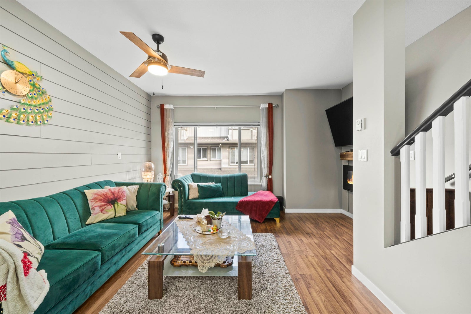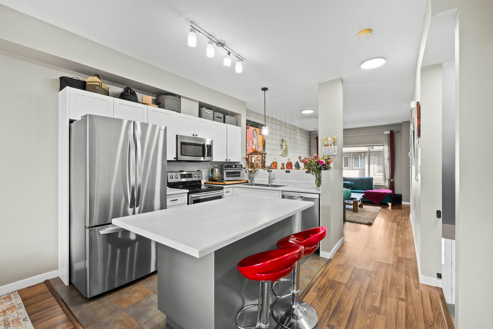 Beautifully updated home in Encore at Hillcrest! This 2 bedroom + den (easily a 3rd bedroom) is in one of the best spots in the complex, with walk-out access to a south-facing yard featuring a nice deck and low-maintenance turf backing onto a park and playground. The kitchen has been tastefully updated with newer appliances, two-tone cabinetry, and an island. New laminate flooring, and charming details throughout make this home truly stand out. Tandem garage fits two cars with extra storage, plus EV charger. Two pets welcome with no size restrictions. Just steps to Hillcrest Elementary, Save-On, Tim Hortons, medical offices, banking, restaurants, future skytrain stations and more. A warm and inviting place to call home!